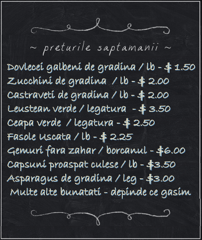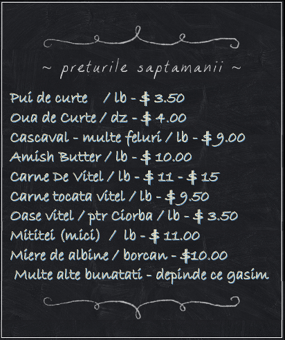 Bine de stiut! - Preturile afisate sunt orientative si se pot schimba saptamanal fara a fi anuntate aici pe website in timp datorita faptului ca saptamanal mergand la producatori preturile se pot micsora sau creste in functie de volumul de marfa comparata si existenta la ferma. Desi ne straduim sa tinem acest website up to date pot exista saptamani in care nu avem timp a facem update la preturi. Asadar cel mai sigur trimiteti-ne un mesaj daca doriti sa va comunicam pretul exact in acea saptamana. Va multumim pentru intelegere.